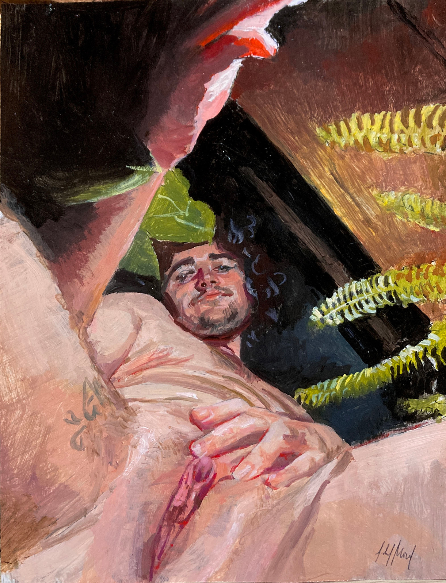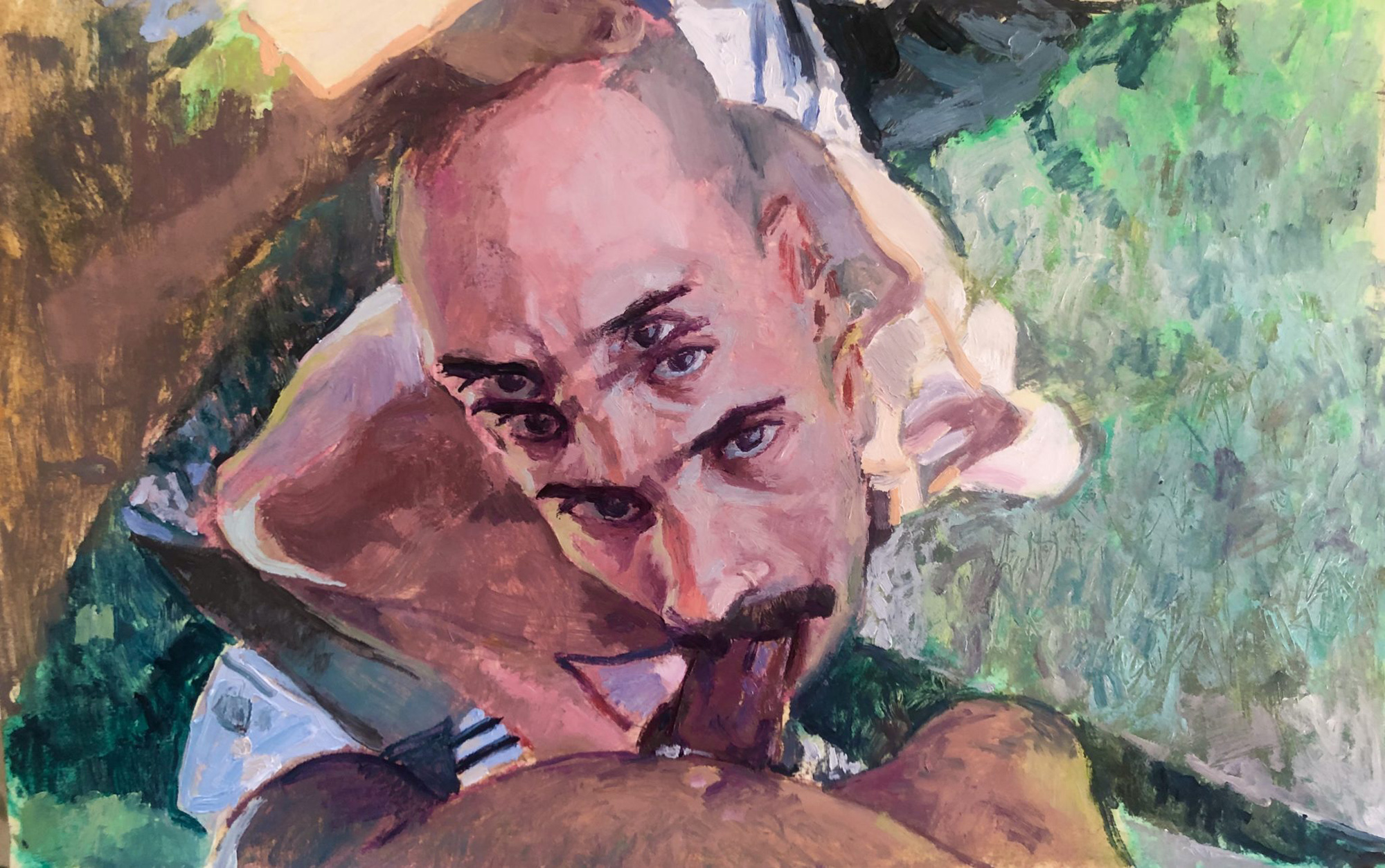 Podríamos presenciar una felación o el momento en el que se orina en la boca. Lo cierto que el punto de vista de esta imagen nos convierte en sujeto que penetra. La pintura, realizada con soltura, nos presenta en el rostro del joven que recibe el pene en su boca una multiplicación de su mirada, generando una extrañeza híbrida. El joven arrodillado se convierte en todo expectación. No desea perder ojo.