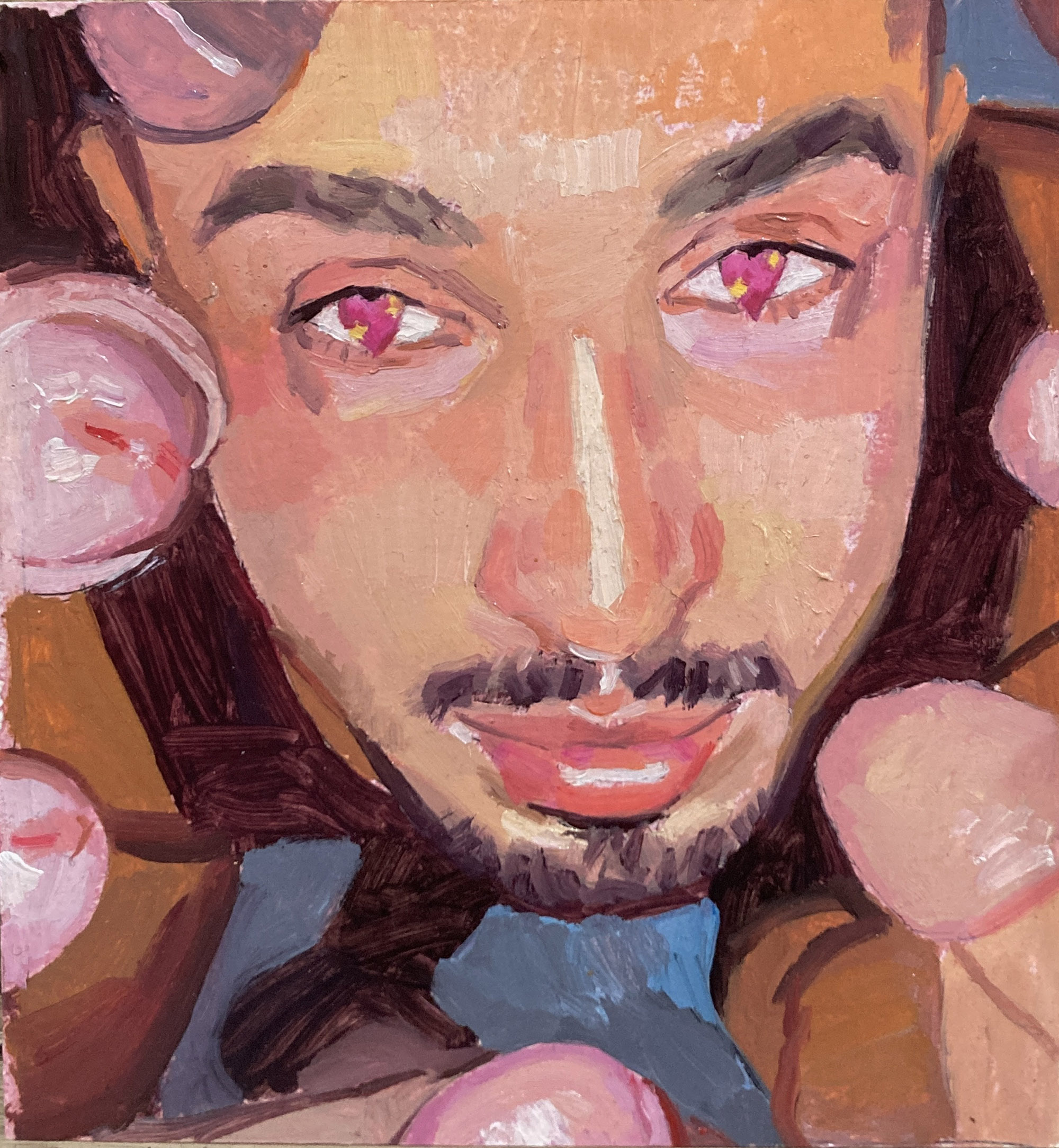 Un primerísimo primer plano en picado de un joven. Sus pupilas han sido sustituidas por emoticonos de corazones rosas que brillan. A su alrededor aparecen distintos glandes. Sus formas curvas y orgánicas se asemejan a la de los corazones, logrando que estos pasen desapercibidos.