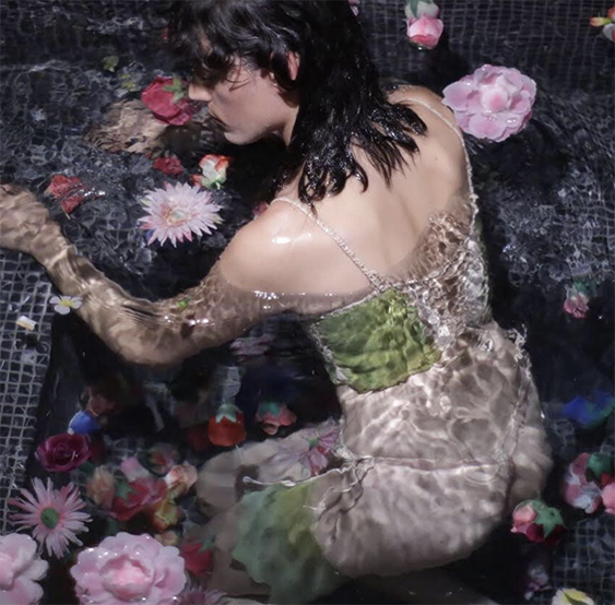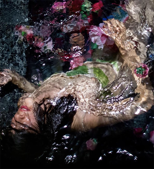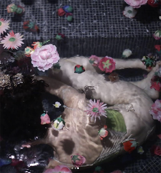 Podríamos comprender esta pieza como una continuación de la serie Swimming Pool pero con notables diferencias. El jacuzzi de Woops Experimental está lleno de flores de plástico. Bella lleva un vestido de látex hecho a mano que cambia de color con la temperatura. Dentro del agua, se mueve, se agita, salpica. Antes del evento se ha cubierto al completo con un material que se ha solidificado, ahora se lo puede arrancar como una piel muerta. Una segunda piel que se retira a trozos, generando cierta aversión y sentimiento de conversión. Ya con el teclado, explora las posibilidades de su voz dentro y fuera del agua. Esta es una acción en continua transición de una cosa a otra.