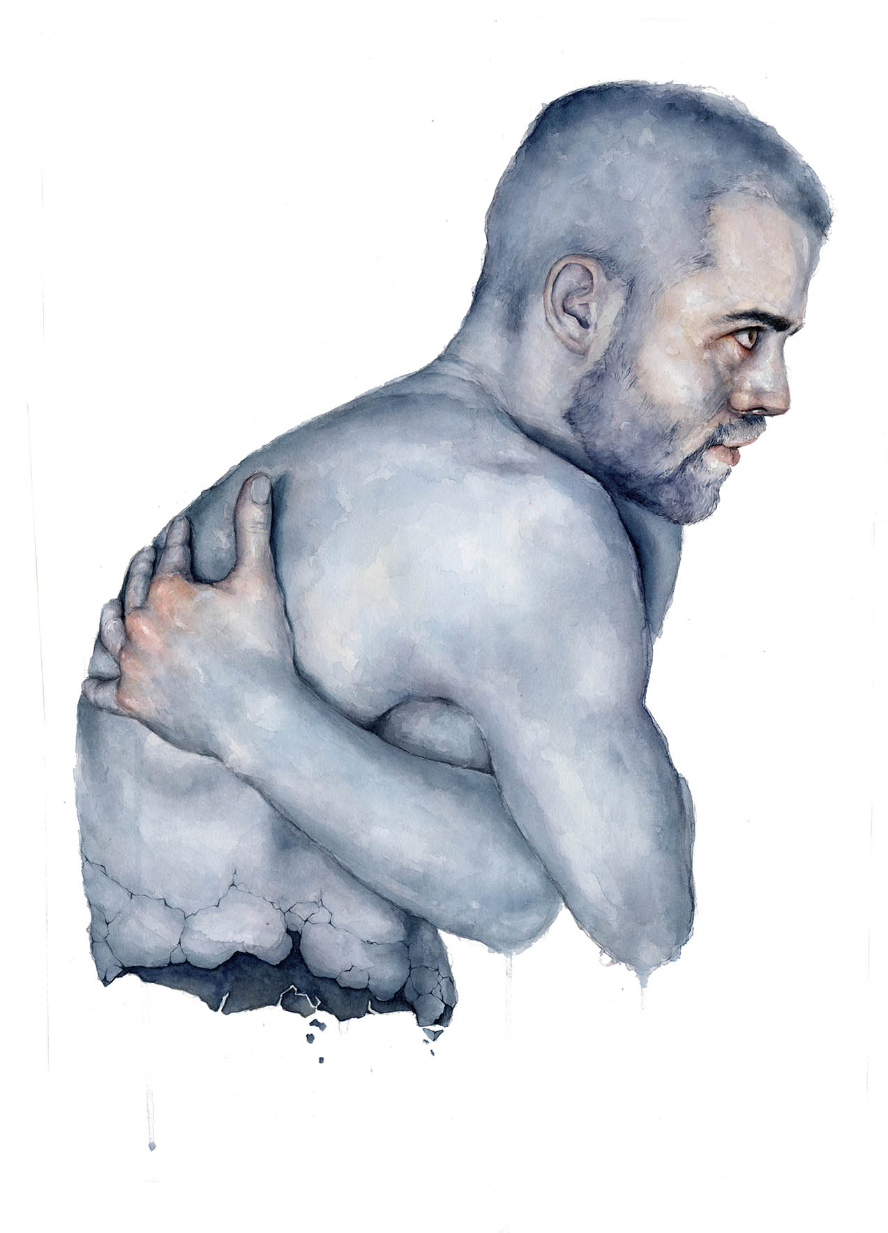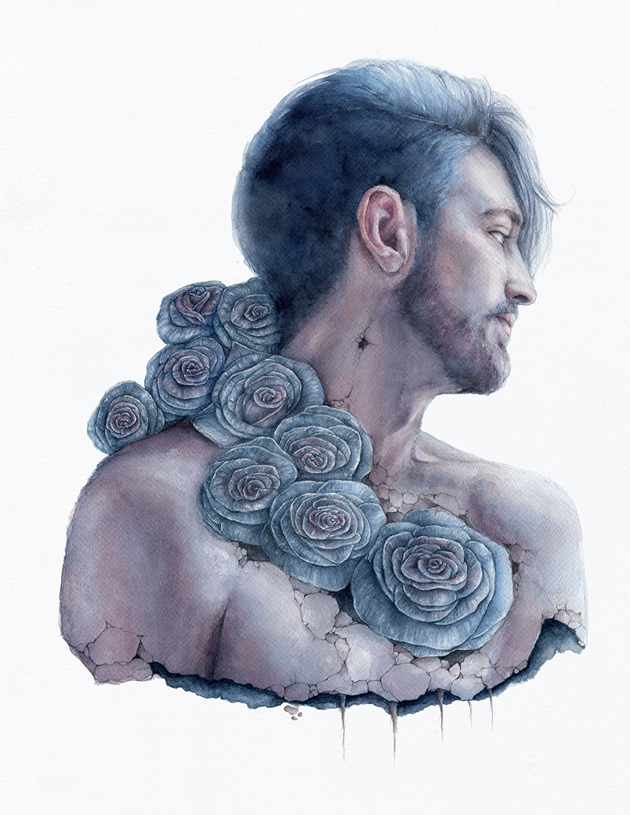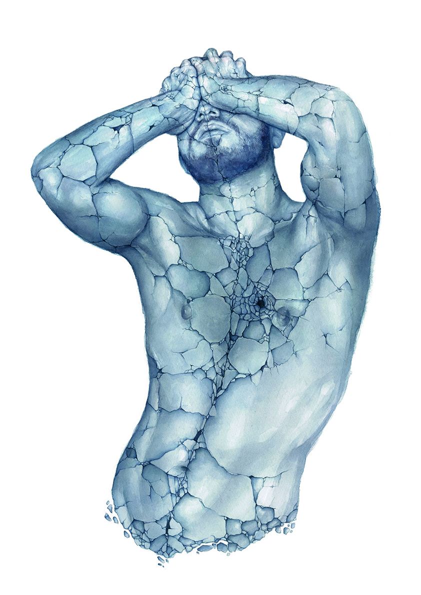 En esta serie aborda masculinidades alternativas, como espacio donde, como persona altamente sensible, poder cuestionar modelos y estereotipos. ¿Por qué los hombres huyen del sentimentalismo? En contra de una visión de fortaleza heroica, Fiore presenta hombres sumidos en la fragilidad, el quiebre y el llanto, rompiéndose en cientos de pedazos, como si la piel fuese una fina armadura que pese a su gran resistencia resulta sencillo quebrar, como cáscara de huevo. El huevo no sólo hace referencia al testículo, sino a la protección de toda vida interior. Sin embargo, en sus figuras se revela un interior desolado por un gran vacío. Usa la acuarela, como técnica menor de la pintura, relegada al boceto preparatorio. Si la acuarela apenas aparece en los grandes museos, ell+ siente una gran afinidad en este rechazo. La incorpora de forma autodidacta, aprovechando la dificultad y el error para generar imágenes suaves, delicadas, etéreas, que potencian su discurso. Esta agua llena de color le permite trabajar con gran riqueza, produciendo unas machas que se resisten al control y se entregan a la aleatoriedad. Es más, potencia esta sensación transparente y acuosa tan próxima al llanto, como si dibujase, metafóricamente, con sus propias lágrimas. El azul grisáceo es el color con el que construye todo su imaginario, un tono frío y distante que habla de desconsuelo, abatimiento y tristeza. En estos cuerpos masculinos es habitual que emerjan flores, como lugar donde aún queda espacio para la esperanza, el color y la belleza.