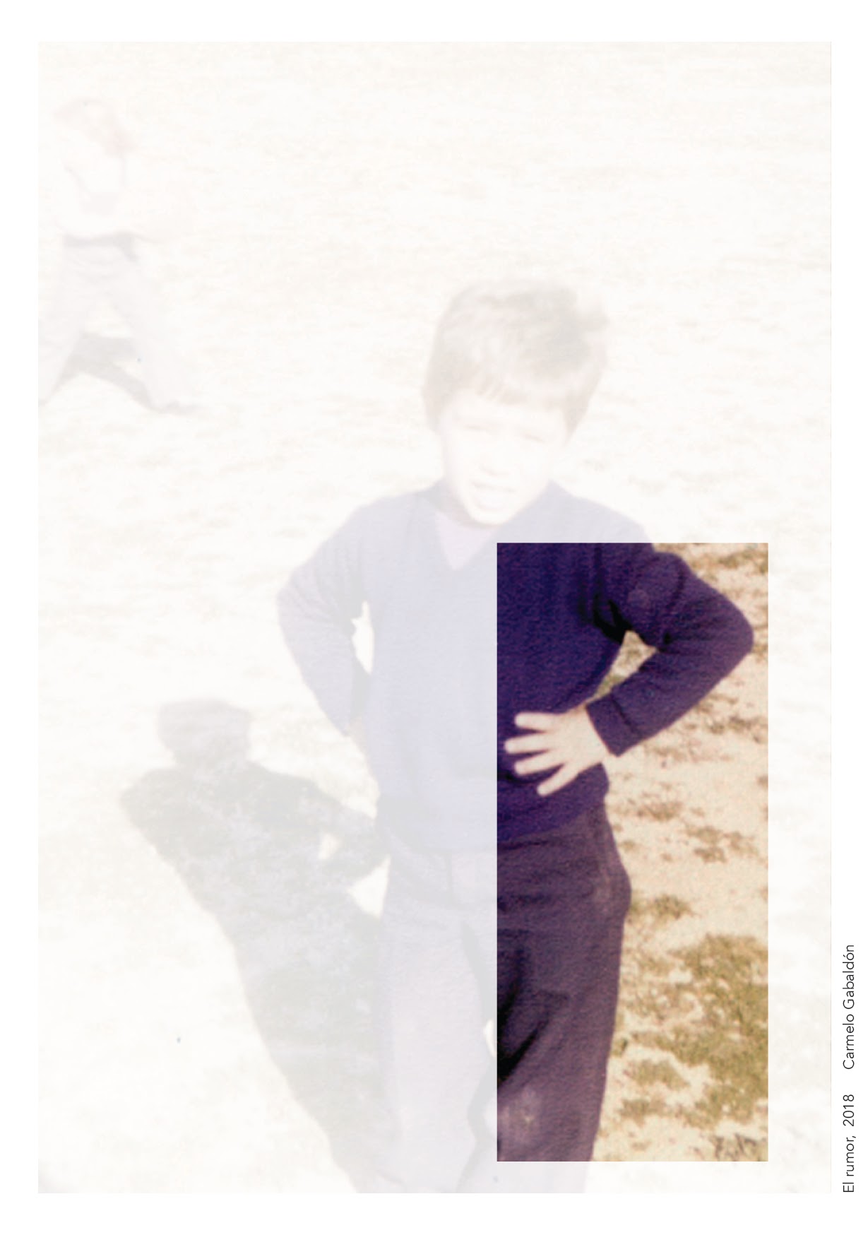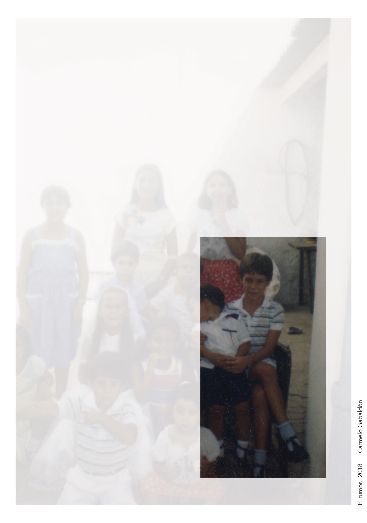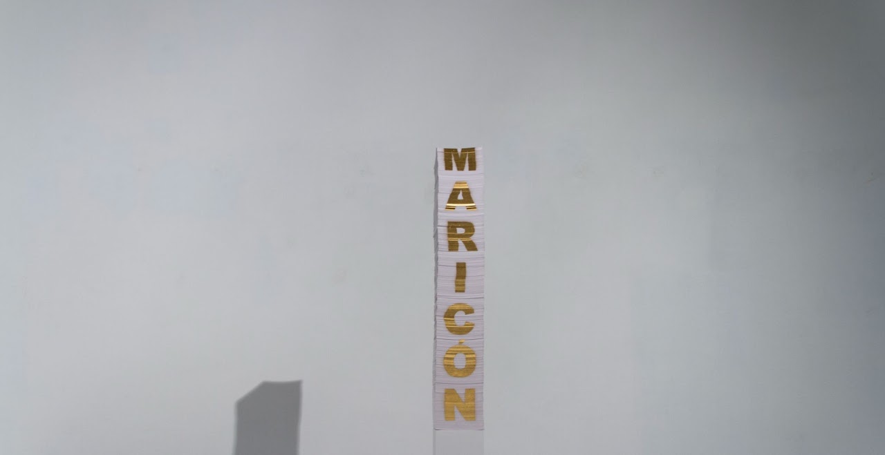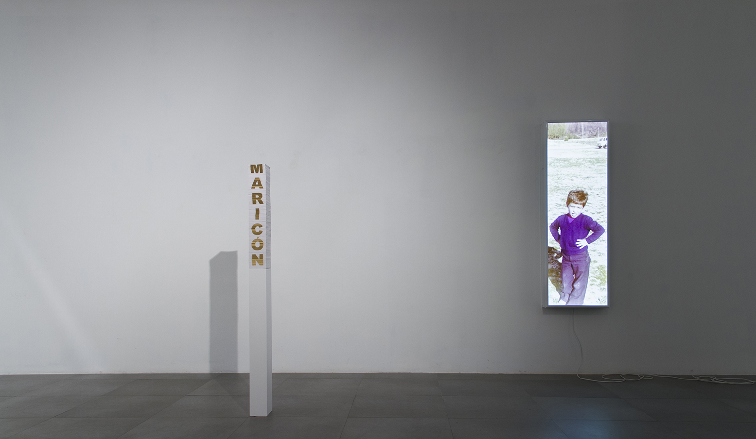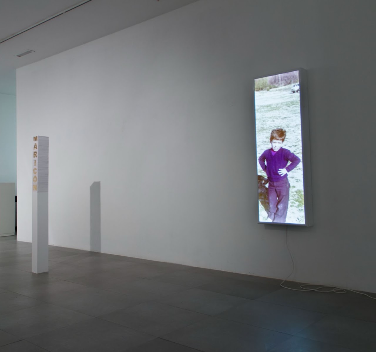 La instalación parte de una fotografía personal de infancia, en la que aparece él mismo con una pose amanerada. Durante años, esa fotografía supuso un conflicto interno de autorreconocimiento y aceptación, rechazando y huyendo de lo que una instantánea había capturado. Esa confrontación de uno mismo cuando aún no es capaz de aceptarse, por saber que no será aceptado por los demás, deja una huella dolorosa. Le marca la necesidad de mirar atrás, ya que el pasado define el presente. Ahora, en un ejercicio contrario, en el que exorciza la imagen del pasado, convierte esa fotografía en un luminoso publicitario como gesto de empoderamiento y afirmación próximo al lenguaje publicitario de lo que se legitima y valida. Lo íntimo se exhibe y sobredimensiona con una convicción contestataria que aspira a desprenderse de las convenciones y revindicar con orgullo su condición marica. Junto a esta imagen presenta una columna de postales que reproducen la misma fotografía, junto a otra del mismo carácter, unas 1975 veces, haciendo referencia al año en el que nace. Sobre el lateral de la columna, en letras doradas escribe la palabra MARICÓN. Al igual que las pilas fotográficas de Felix Gonzalez-Torres, estos cuerpos también irán desapareciendo durante la exposición, disgregándose como un rumor, el mismo rumor que se extiende en su juventud.