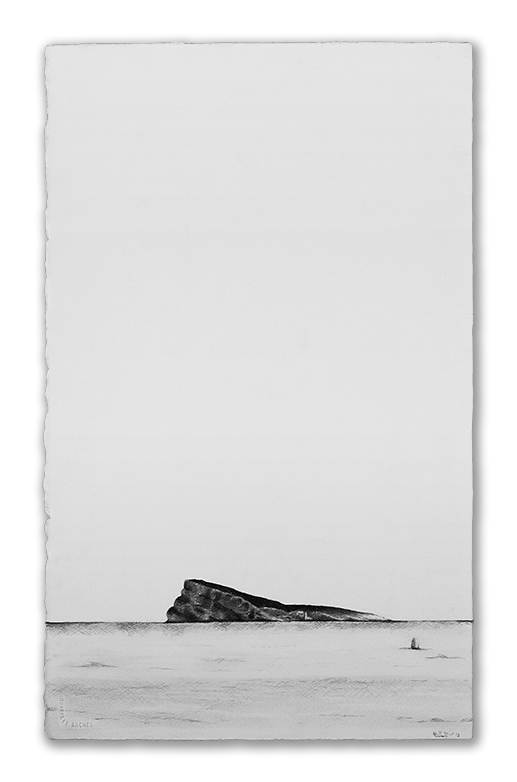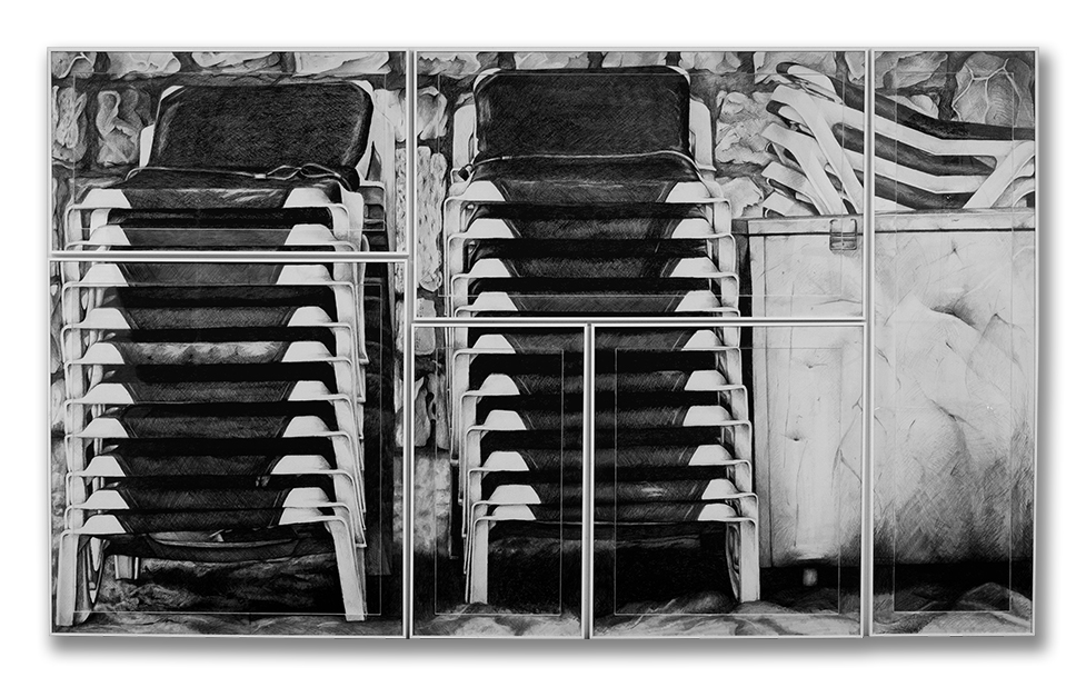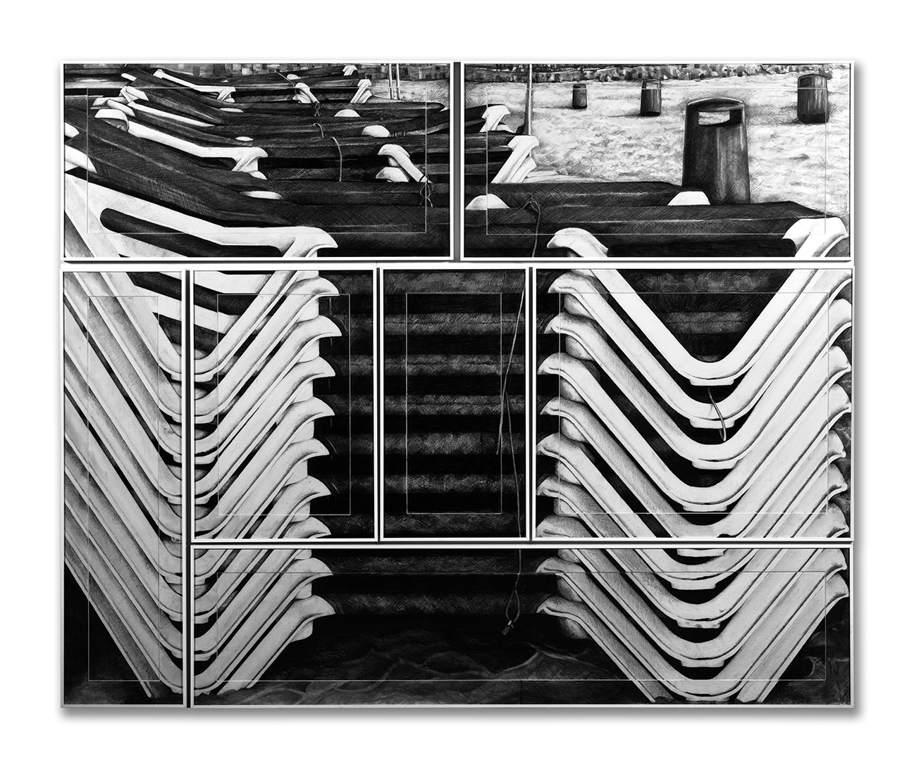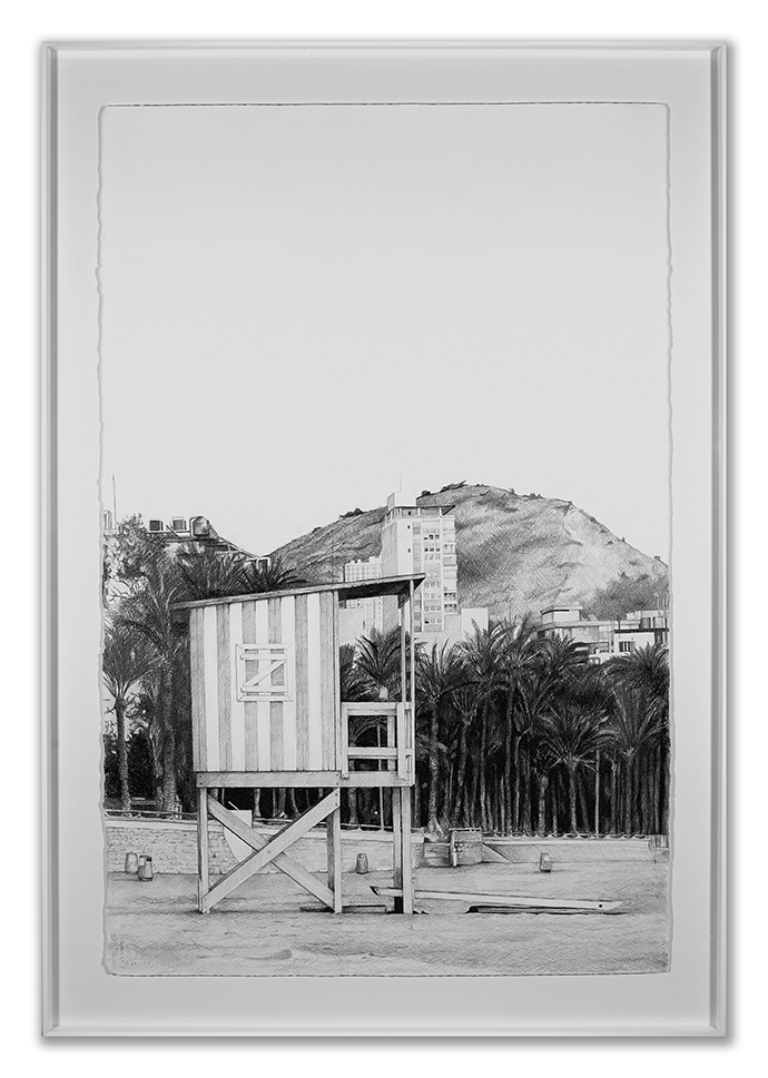 La exposición en la Galería Kessler Battaglia se concibe como una instalación en su conjunto. Dibujos de gran formato en blanco y negro están fragmentados en piezas de menor tamaño. En la sala observamos unas hamacas recogidas (en dos puntos de vista, frontal y lateral), un muro, unas escaleras. Dos dibujos pequeños nos sitúan: la caseta del vigilante y la montaña de la isla de Benidorm. No hay personajes. Tampoco tenemos indicadores que nos señalen qué hora es. Podría ser un atardecer o un amanecer. Un instante ubicado entre los usos post- o pre- de la playa, como si con este silencio nos hablase de un tiempo detenido, tenso, lleno de nostalgia y melancolía. La resolución de los dibujos a grafito sobre papel de acuarela es tan detallada y nítida, que da la sensación de estar frente a un objeto tridimensional. Aquí es donde se manifiesta la capacidad de trampantojo de la imagen, su técnica y su perspectiva. Daniel Tejero se vale de esta estrategia para conseguir dos aspectos. En primer lugar, le interesa ubicarnos en un espacio envolvente, para que nos creamos que nos encontramos en él a través de una anotación sobredimensionada que constantemente, a través del uso de un papel de dimensiones abarcables, nos recuerda la escala humana (en la contemplación y en el hacer). Y en segundo lugar nos quiere conducir al terreno de la ilustración científica. Este último aspecto también se percibe en los títulos en latín, como dirigiendo el conocimiento que las imágenes nos ofrece hacia un saber objetivo e incuestionable. Nombra lo innombrable usando el mismo código de las cosas que se pueden nombrar. Con esta nueva nomenclatura, pretende construir una clasificación del mundo sexoafectivo entre hombres.