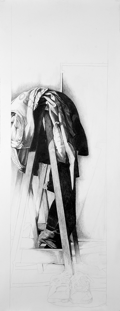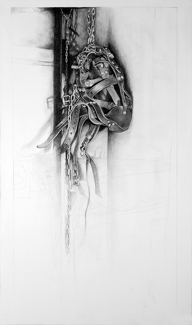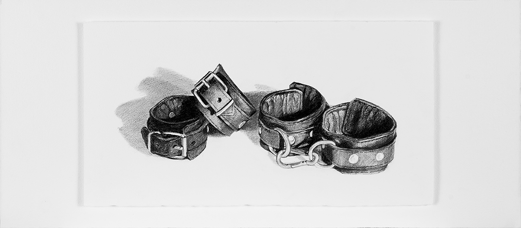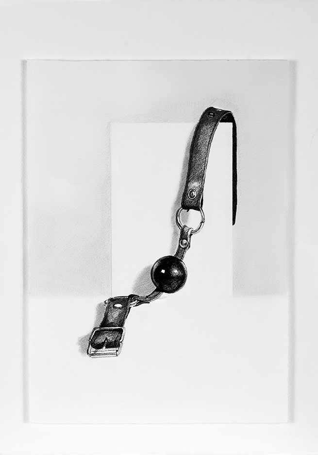 Sus escenas, como suspendidas en el tiempo, a modo de fantasmagorías, nos cuentan que algo acaba de ocurrir o va a suceder. En sus dibujos vemos ropa colgando, correas, collares D/s, mordazas, dildos, botellas de agua, cadenas, grilletes, lubricantes, guantes de látex, cockrings. Se convierten en objetos fetiche o tal vez en objetos del fetichismo. Los elementos se dibujan con rotunda nitidez para que el espacio desaparezca en el blanco del papel, aludiendo al vacío. Tejero nos obliga a mirar lo que él desea, en una nueva relación amo-esclavo, dolor-placer, dominador-sumiso.