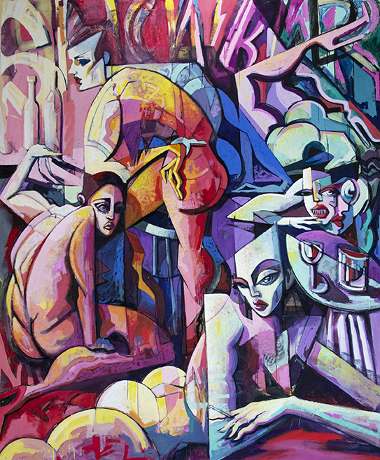 Esta pintura reinterpreta Las señoritas de Avignon (1907) de Pablo Picasso. Si en su momento Picasso puso en valor la prostitución, Munyoz da un paso adelante al reivindicar el travestismo. Su cuadro es vibrante y colorista que se apropia del lenguaje cubista para situar a sus cuatro drags en un bar de copas. Los cuerpos desnudos y sus rostros se estilizan y deforman. Cada personaje adquiere un tono particular, relacionando su pose y presencia con una experiencia única. Sus rostros pueden ser leídos como máscaras intercambiables, jugando con el concepto de identidad fluida. En el fondo, un conjunto de letras se integra de tal manera que casi pasa desapercibido, añadiendo en un susurro visual el propio título de la obra.