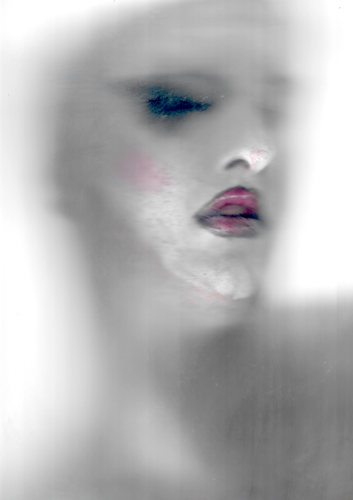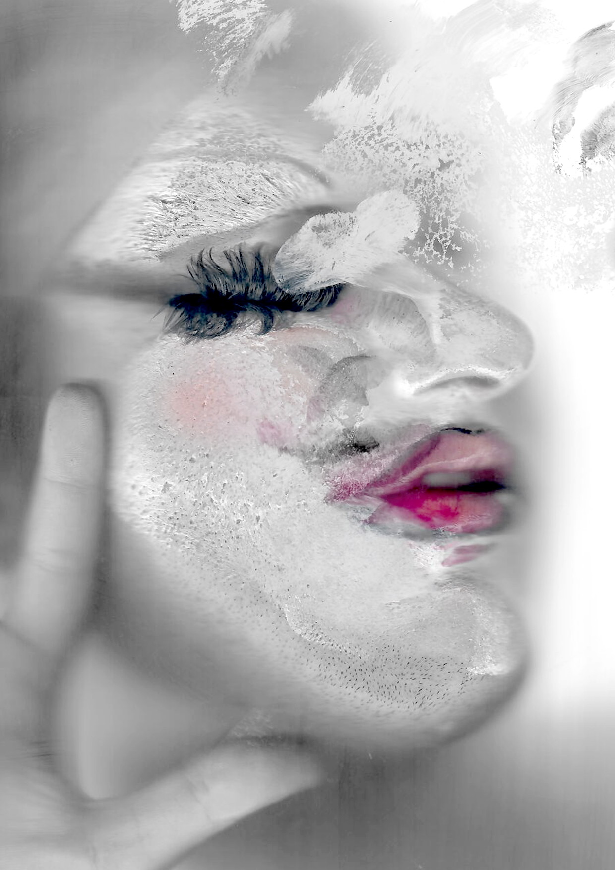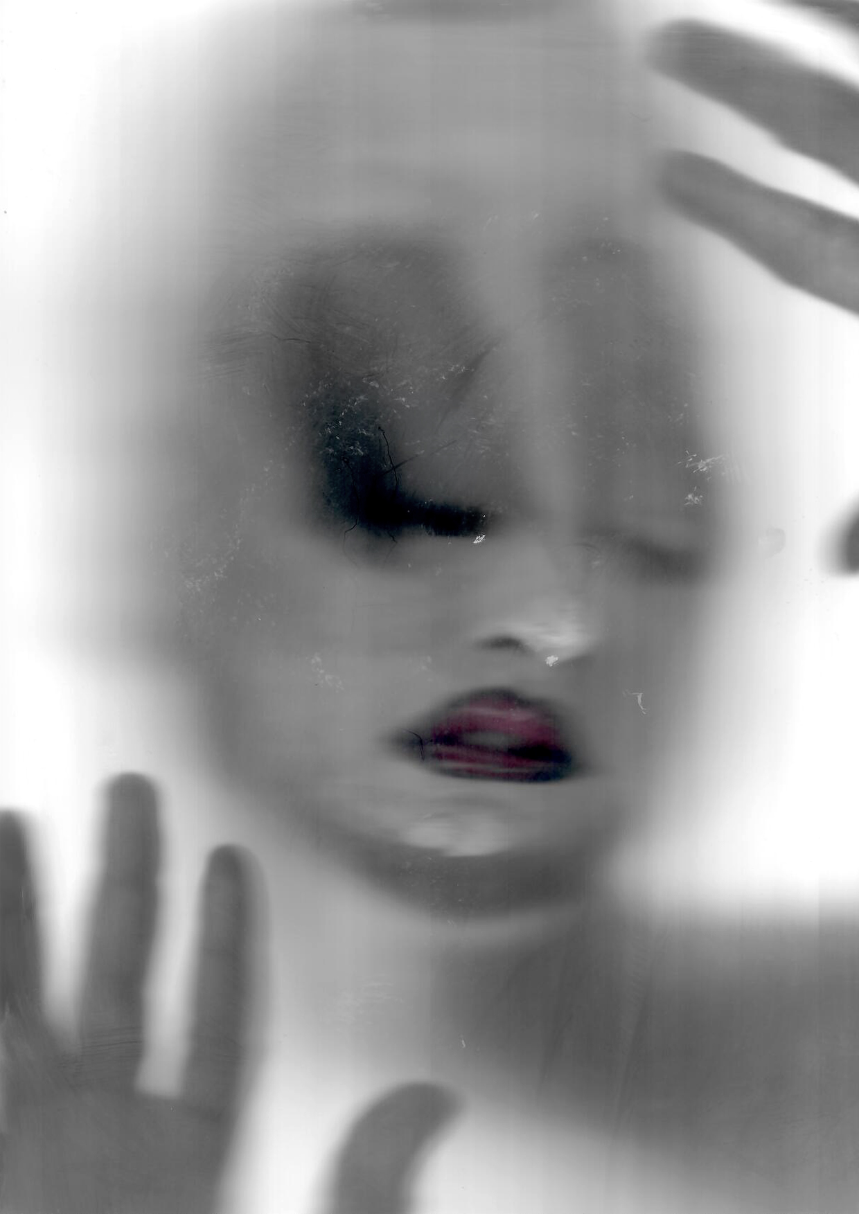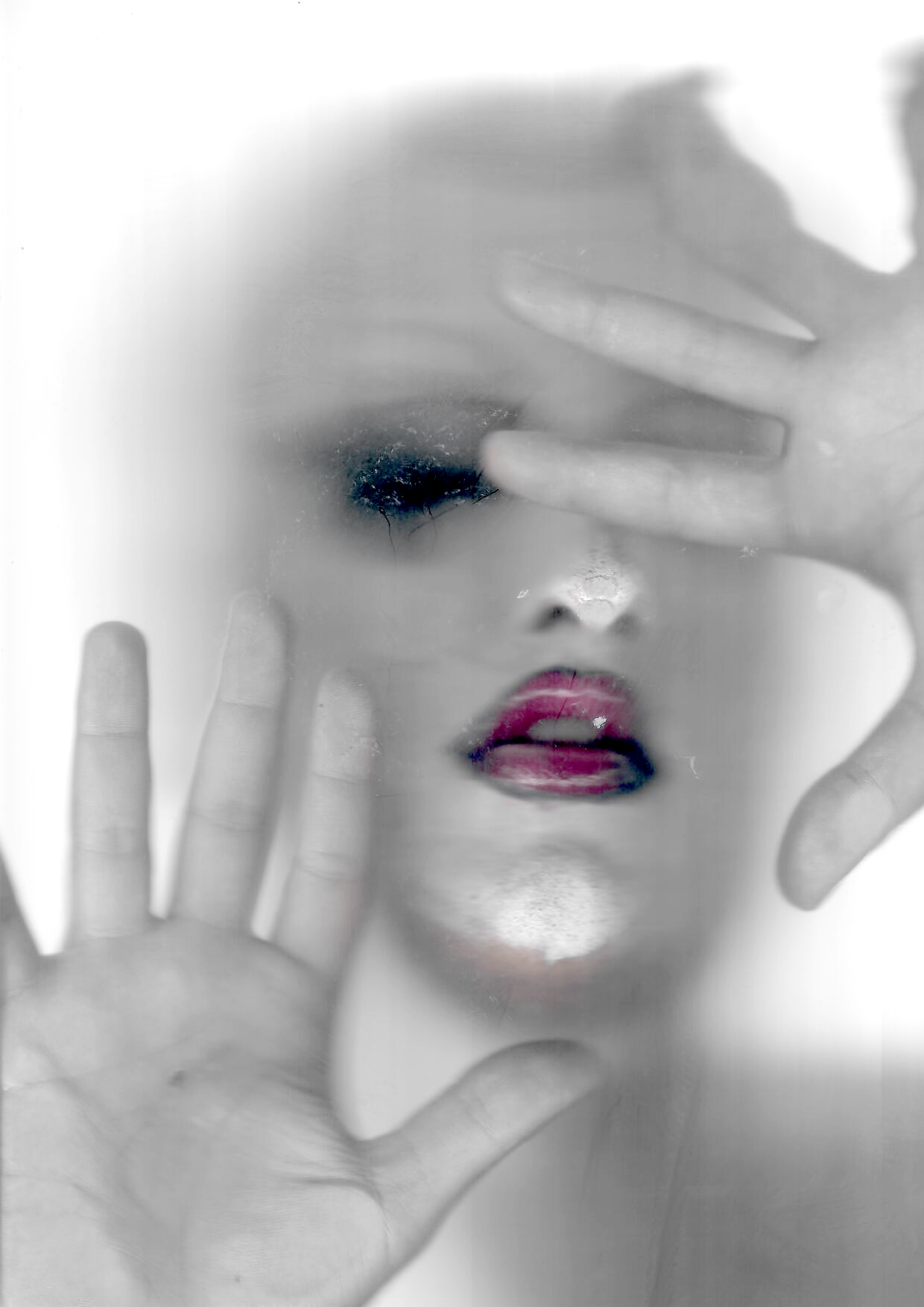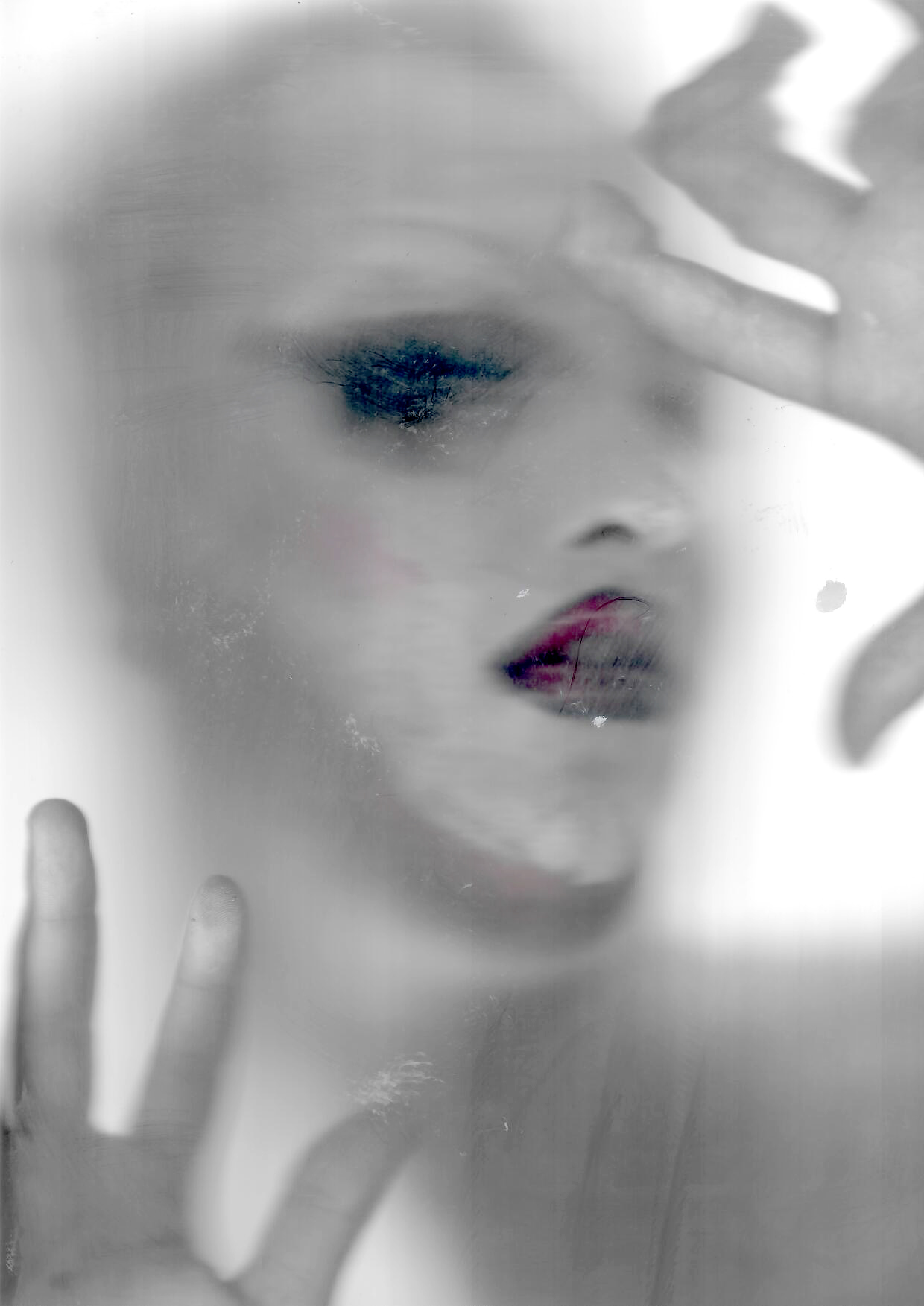 Una serie de imágenes muestra el mismo rostro blanco. Los únicos puntos de color se encuentran en los labios, de un poderoso magenta perfilado en negro, y en las pestañas postizas, de un profundo azul petróleo. En ocasiones, el rostro se asoma de forma tímida; en otras, se estampa directamente sobre la superficie, dejando un rastro de huellas, vaho y manchas. A veces, las manos se apoyan para enmarcar la cara, cerrando la identidad, dándole un sustento provisional. Las imágenes están deformadas por un barrido, evidenciando que se han construido por partes. El yo se distorsiona en una fantasmagoría inquietante, con límites poco nítidos, poco sólidos.