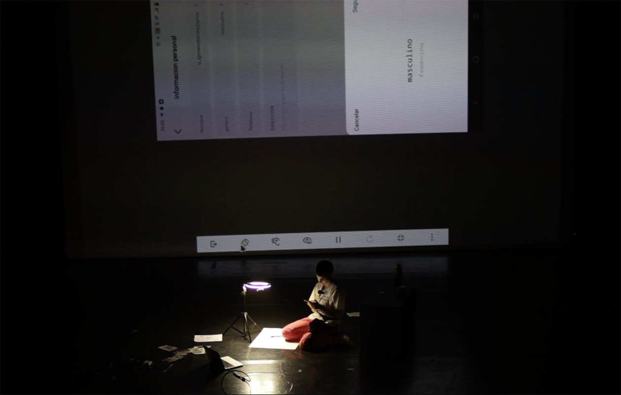 Al principio de la acción, Gimeno Bardis activa una serie de dispensadores en el espacio. En su narración explica que los dispensadores liberan xenotestosterona obtenida del polen de pino. Ell+ mism+ lleva una prótesis que sirve como dispensador de hormonas. Un tubo une el dispensador con el ano. A través de una aplicación móvil libera cada 90' una dosis de hormonas que absorbe su cuerpo, alterando sus hormonas en directo. Y, mientras, también se alteran las hormonas del público al respirar el polen liberado en la sala.