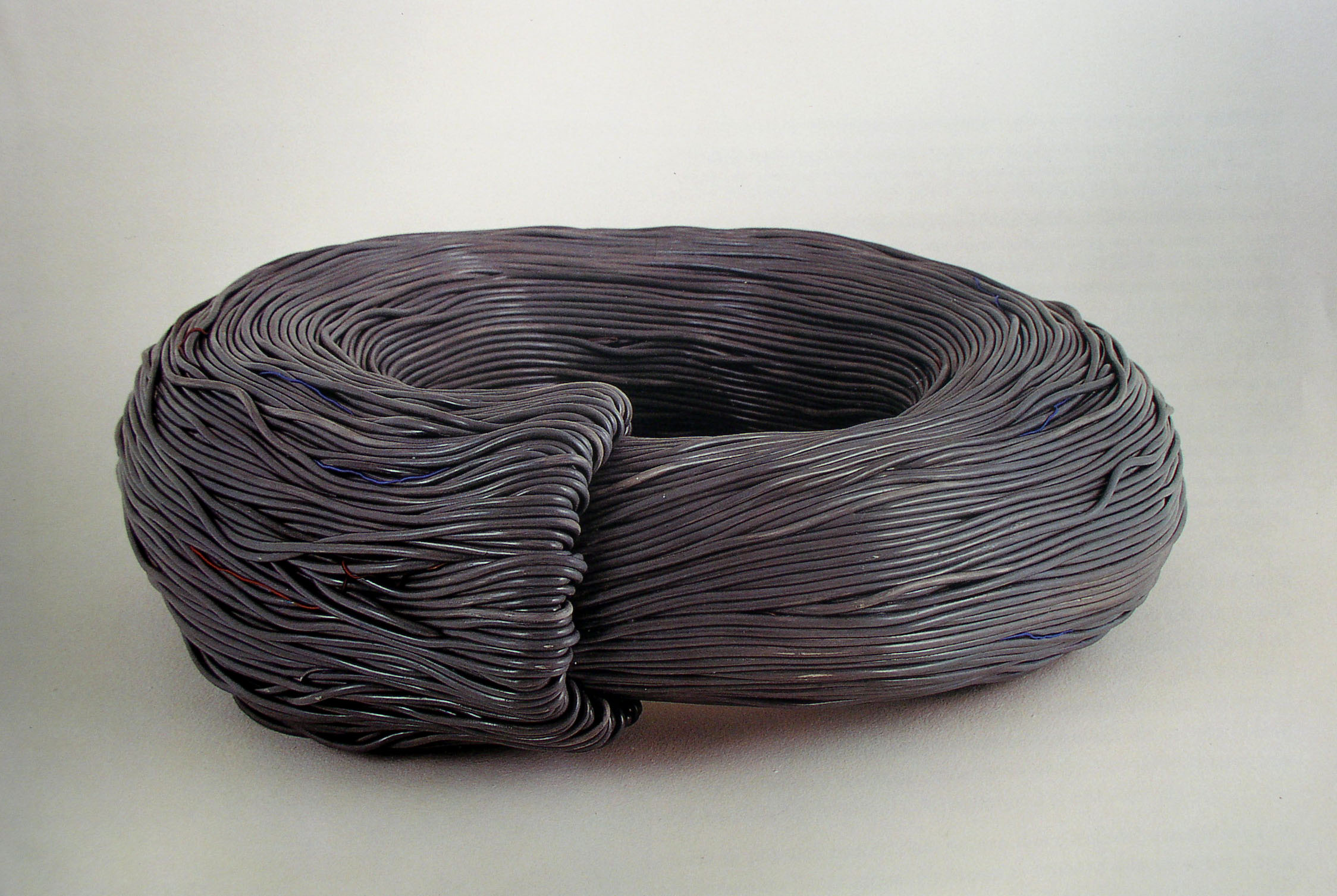 Autofagia masculina es un objeto solipsista que no sale de sí mismo. En el imaginario del artista es habitual encontrar piezas horizontales, largas, que descansan rígidas, como preparadas para la acción. Las podemos contemplar como consoladores, o falos sobredimensionados, que nos amenazan, acechan y atraen. Están construidos con cientos y cientos de cables, en una interconectividad que señala los flujos de información, sangre y deseo. En esta ocasión es como si el falo se girase, para llegar a sí mismo y devorarse, o quizás penetrarse, en un ejercicio de autosatisfacción narcisista. Aquí el cable hace alusión a la dimensión táctil de las terminaciones nerviosas de esfínteres y mucosas. Al final, consigue un círculo negro lleno de estrías, transformando el dildo inicial en un ano.