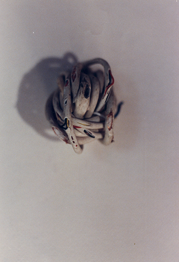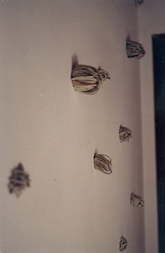 De la pared de una habitación emergen, como quistes, los cuerpos apelotonados de cables viejos, dañados, podridos. Han perdido su blancura y ahora muestran sus tripas, aquello que a priori deben guardar con celo bajo una cobertura profiláctica. Disgregados por el espacio, se presentan como tumores sin comunicación. Con todo ello, Martínez Oliva hace referencia a la pandemia del sida, al sarcoma de Kaposi y a todos los cuerpos que, a causa del VIH-sida, progresivamente, se descomponen de una manera trágica e irremediable.
