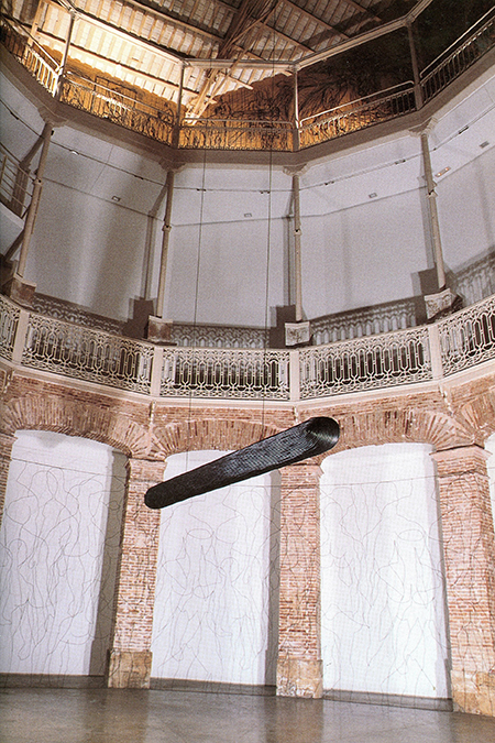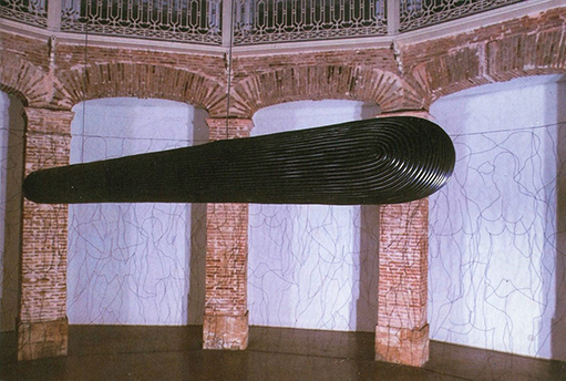 Como si fuese el opuesto del falo de Fluidos discontínuos, en esta ocasión trabaja con una forma parecida hecha con cable negro. El objeto queda flotando en el espacio, como si fuese una amenaza sobre la cabeza de l+s espectador+s.