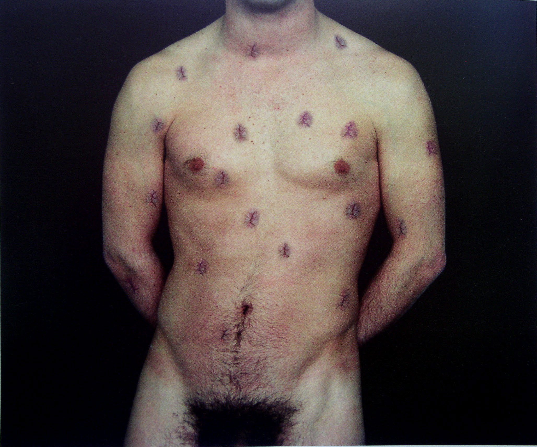 Esta fotografía presenta un torso sin rostro, expone el cuerpo anulando el sujeto. Sobre su piel vemos un montón de anos. Los porqués viajan entre la dermatología y la venereología. Estos anos diseminados por la piel pueden ser entendidos como pústula, o sarcoma de Kaposi. La piel pública, que se enseña sin tapujos al exterior, de pronto se tiñe de máculas que han de permanecer en el terreno de lo privado. El culo, así abierto y multiplicado, se exhibe sin tapujos ante cualquier especulación. Con esta imagen, Martínez Oliva hace alusión directa a la crisis del sida y a los efectos que tuvo sobre los cuerpos de l+s afectad+s, cuerpos que se percibieron como una amenaza.