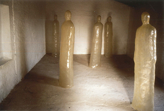 En una sala se nos presentan las figuras erguidas de cinco cuerpos hechos de un material de color nácar, semitransparente. De cerca parecen las siluetas de hombres, se insinúan sus brazos. De lejos se identifican como condones. En esta relación de cuerpos fantasmales y profilácticos, la pieza genera una tensión silenciosa entre la protección y la barrera, como si algo hubiese ocurrido o estuviese a punto de suceder. No podemos sino pensar en el sida y todas aquellas vidas que se pierden en la concatenación ausencia de preservativo-ausencia de vida.