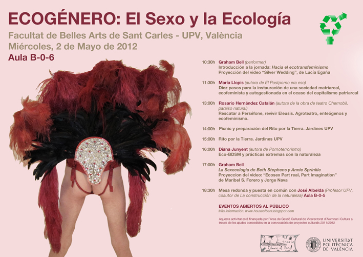 En 2012 se organiza el ciclo de conferencias ECOGÉNERO, compuesto por dos jornadas. La primera, titulada ECOGÉNERO. Una Jornada sobre Eco(trans)feminismos (26 de marzo de 2012), tiene lugar en la Facultad de Ciencias Sociales de la Universitat de València. Participan Graham Bell Tornado con la charla “Conceptos de Ecogénero y Ecosexualidad”; Verónica Perales, del colectivo ecoartivista Transnational Temps, con “Cient@s Amando: subvirtiendo amar”; y el colectivo transfeminista ideadestroyingmuros con el taller “Ecodrag”. La segunda jornada, ECOGÉNERO: El sexo y la ecología (2 de mayo de 2012), se lleva a cabo en la Facultad de Belles Arts de la Universitat Politècnica de València. Las ponencias están a cargo de l+s artistas y activistas Graham Bell Tornado, Maria Llopis, Rosario Hernández Catalán y Diana J. Torres/Pornoterrorista, quien ofrece una charla sobre Eco BDSM. El día concluye con una mesa redonda moderada por José Albelda (profesor de la Universitat Politècnica de València).