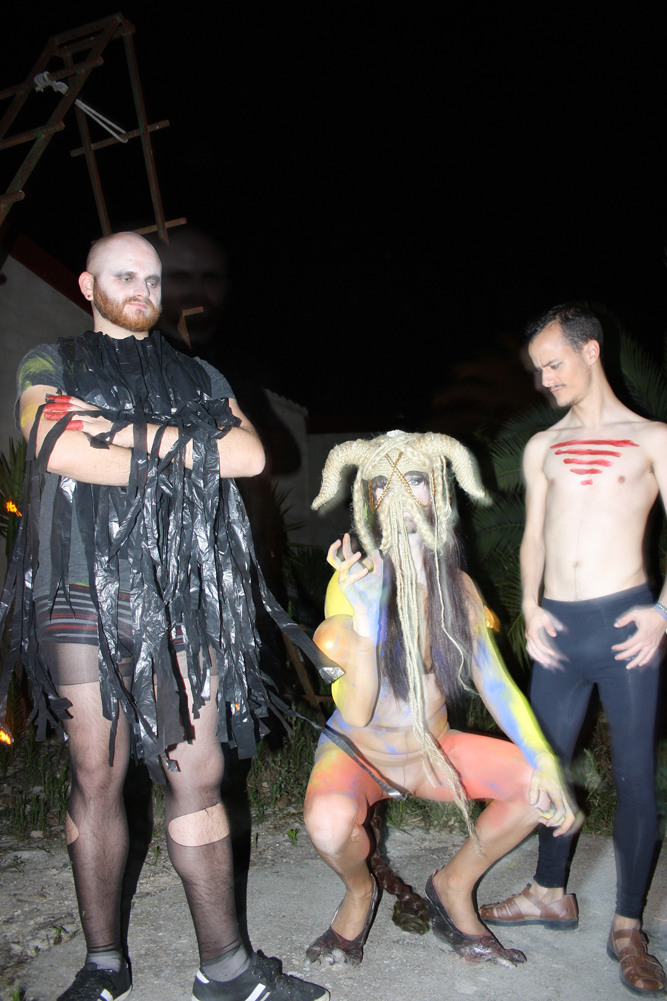 Acción ritualista que combina spoken word, humor y momentos musicales que oscilan entre la crítica democrática y el más absurdo sinsentido. A oscuras, decora con velas La Victoria Vieja, un conjunto arquitectónico del casco histórico de La Victoria. En un vídeo con forma romboidal se proyectan un tropel de imágenes de referentes femeninos. Una voz se pregunta qué hace en la noche, qué haces en la noche. Un cuerpo, entre las sombras, se levanta, se dirige al público. Lleva una máscara blanca, una túnica oscura y unas uñas larguísimas, es Liz Dust. Javier Navarro sale de entre el público y le ayuda a retirar su atuendo. El ambiente roza el ritual oscurantista. Se queda con unas mallas color carne, una peluca de pelo liso negrísimo, y una trenza muy larga que le sale del culo. Navarro le coloca una nueva máscara de formas orgánicas retorcidas, como una mandrágora que se asienta en su rostro. Le añade globos naranjas por el cuerpo. Liz se presenta como la Condesa de Gavia, y de pronto el tono grave que había imperado se rompe con su espontaneidad. Ha vuelto al pueblo, como un ente del pasado, con el firme propósito de ser su alcaldesa. Su intención es convertirse en la ama del pueblo, reduciendo a l+s habitant+s a mer+s súbdit+s, sus perrill+s, l+s denomina de forma cariñosa. Obviamente, no pertenece a ningún partido electoral, pero no duda en presentar su programa. Su intención es usar al actual alcalde como esclavo sexual, para después de un año sacrificarlo. Desea llenar el pueblo de turistas, construyendo un complejo hotelero que llamará Victoria Palace. El pueblo lo teñirá por entero de amarillo. L+s lugareñ+s irán con tacones de mínimo 20 cm. Ubicará una estatua suya en la plaza principal, reformando el edificio del Ayuntamiento a su conveniencia. Además, se usará a sí misma como imagen del festival Art Sur, Arte en Acción. La audiencia acepta la propuesta, y para celebrarlo, baila y se corona como mandataria/virgen/reina/alcaldesa.
