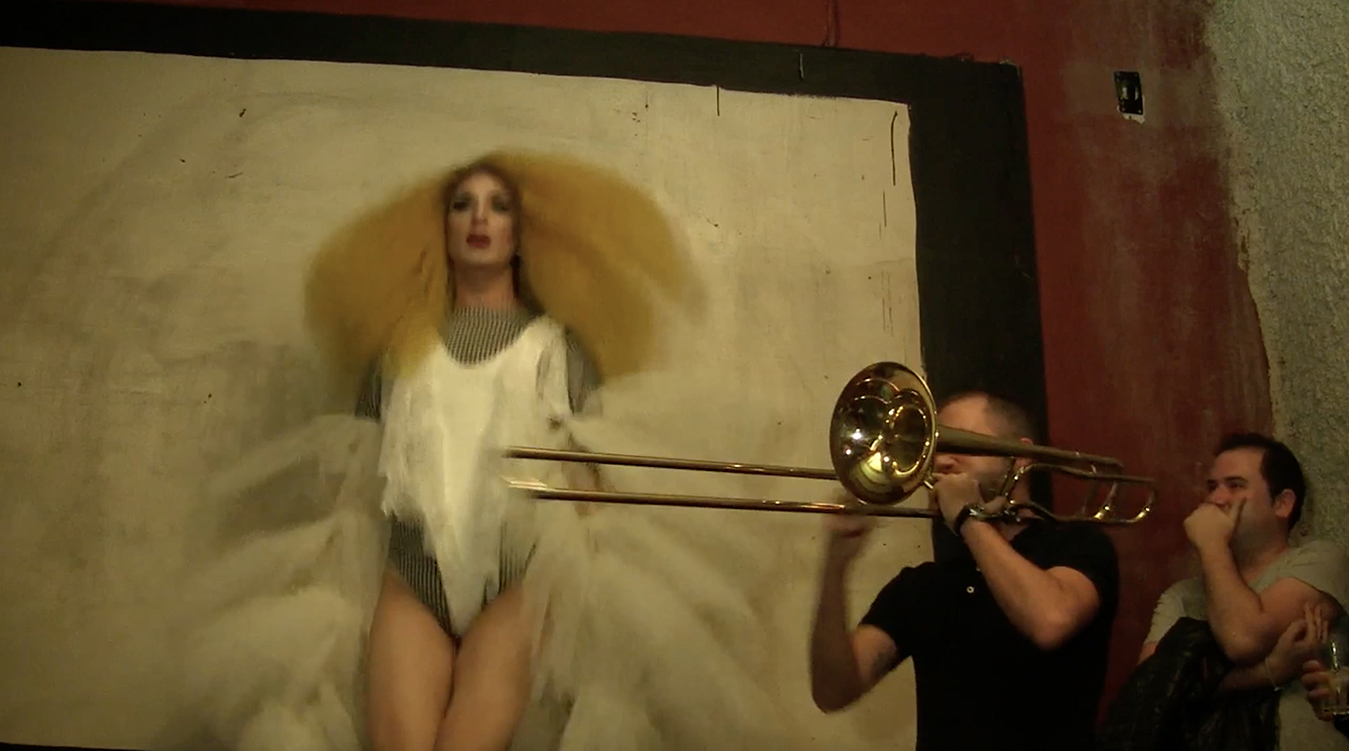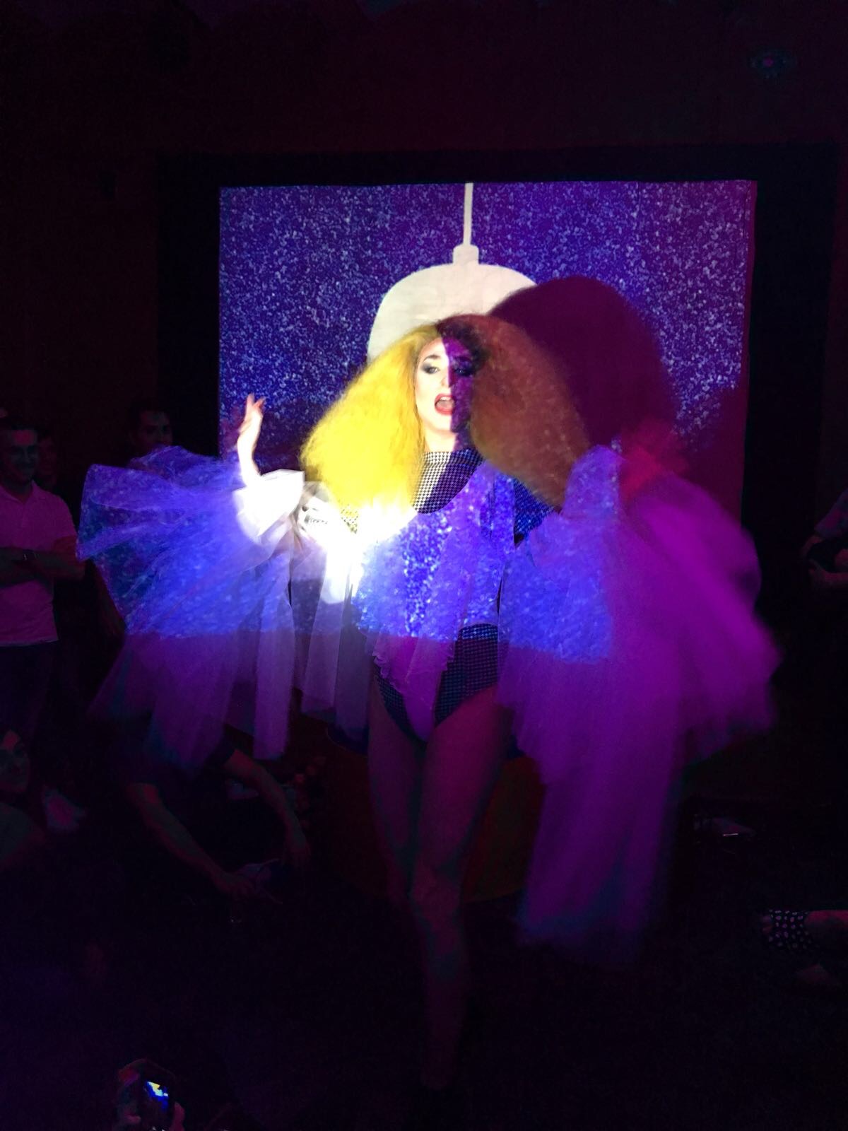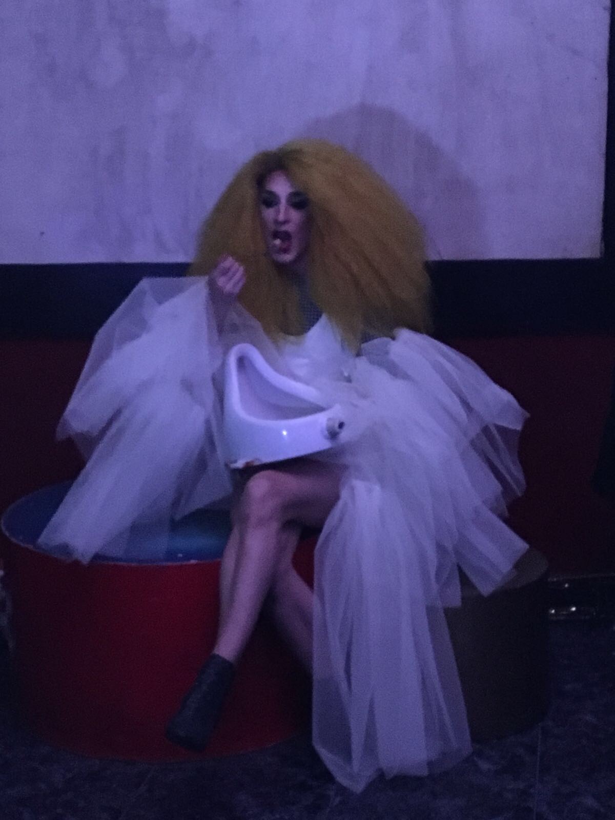 A continuación, explica que llevará a cabo 10 de las peores performances que existen. Acciones que ha recogido en una convocatoria pública a través de Facebook e Instagram. Es consciente de que lo que se espera de una drag no es una performance. ¿Por qué hace ella performance? Porque le permite hacer lo que le sale del coño; un coño conceptual, aclara. Da-Drag no es un término nuevo, acuñado por ella, sin embargo, le sirve para crear situaciones absurdas en continua metamorfosis.