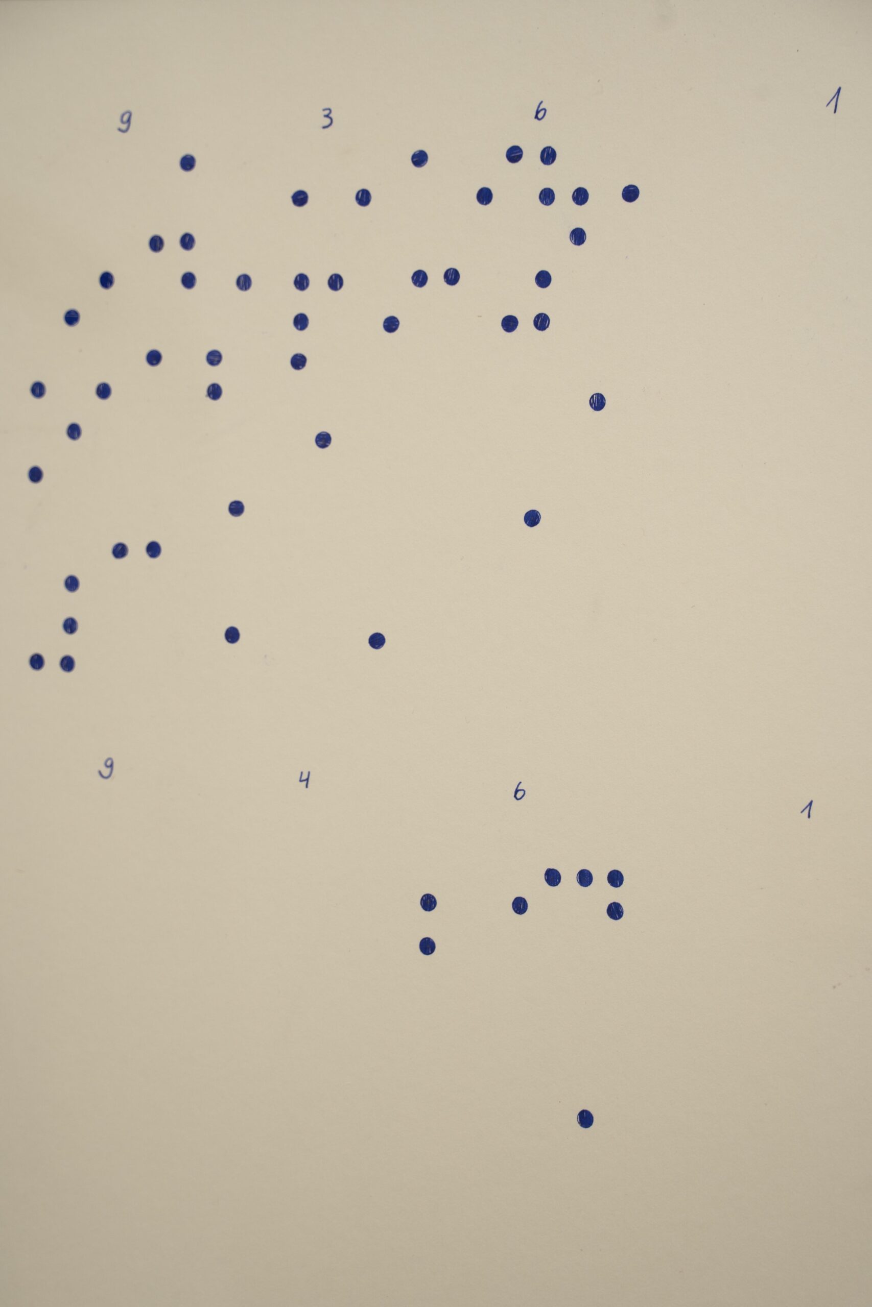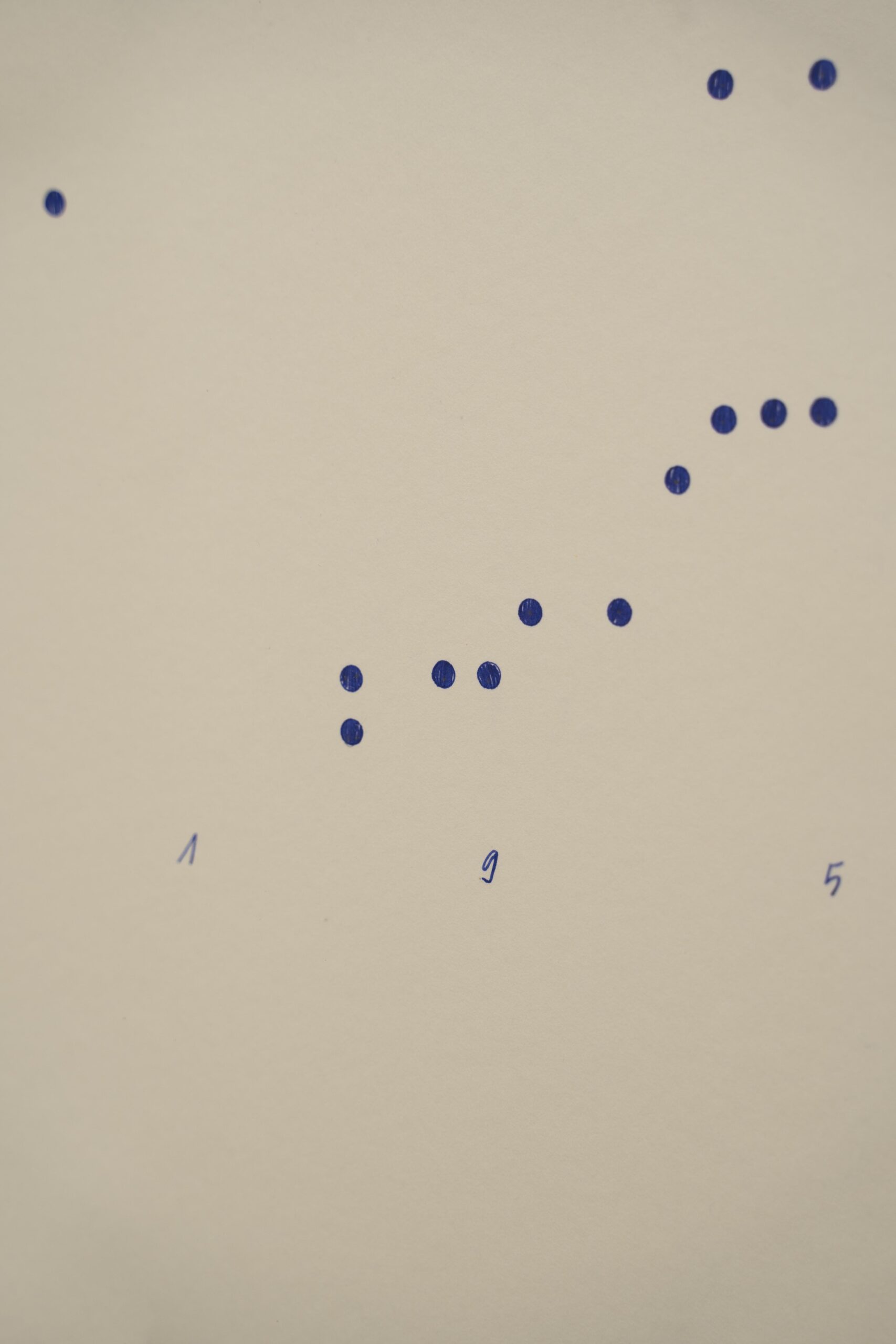 Al igual que en La llanura que quiero atravesar (2023), Tinaut trabaja sobre el Epistolario Carmen Conde - Amanda Junquera (1936-1978) (2021) de Ediciones Torremozas. En esta ocasión genera una tabla del tiempo en el cual, a lo largo de esos 42 años, año a año, mes a mes, semana a semana, señala con un punto azul cada día que se escriben una carta. Estos puntos azules señalan el tiempo en el que las amantes no estuvieron juntas. Cuando la pieza está llena de lagunas, significa que los cuerpos de ambas escritoras no se separaron. Esta dicotomía de elementos configura una pieza binaria como ejercicio que traduce el deseo anhelante, los encuentros y el echar de menos.