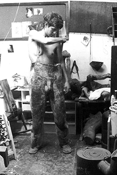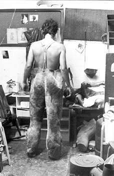 Diego cubre de látex una escultura de corcho de gran tamaño, un desnudo masculino, con el fin de extraer una copia, una piel que retira y fragmenta. Con ella se confecciona unos pantalones a los que les añade unos tirantes de goma elástica. De la pieza queda una serie de fotografías en blanco y negro en las que se observa a la artista con el torso desnudo y los pantalones puestos. Situada en su propio taller, con herramientas y objetos acumulados, es como si pudiésemos leer la identidad como un proceso provisional en construcción. Estas imágenes las toma en soledad, sin dirigir su mirada a cámara, como una exploración íntima hecha para sí misma. Enseñarlas tiempo después supone un ejercicio de exposición personal.