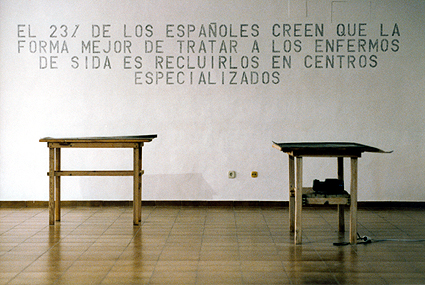 Instalación en la que aborda el sida, la desinformación y el terror al contagio. Organizada en dos partas enfrentadas, en la primera se ve una proyección de diapositivas de un corte de manga. Esta proyección ocupa gran parte de la pared. El gesto podemos traducirlo verbalmente como "que te den por culo". Miralles apunta al contenido homófobo del insulto en una sociedad heterocentrada, vilipendiando continuamente al diferente. a través de una imagen proyectada y una instalación. Al otro lado, sobre la superficie de dos mesas vemos dos imágenes. En una contemplamos un cuerpo desnudo yacente, frágil, se nos muestra encajonado, injuriado, suprimido, con el rostro oculto, como si fuese un cadáver anónimo. En la otra observamos la imagen de un corte de manga. A esta segunda instalación le acompaña un texto dibujado en grafito sobre la pared: