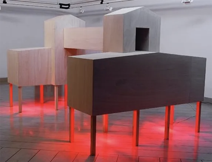 Una luz roja ilumina la parte inferior de la instalación, como una alarma que, aunque activada, permanece sigilosa, oculta bajo los pies.