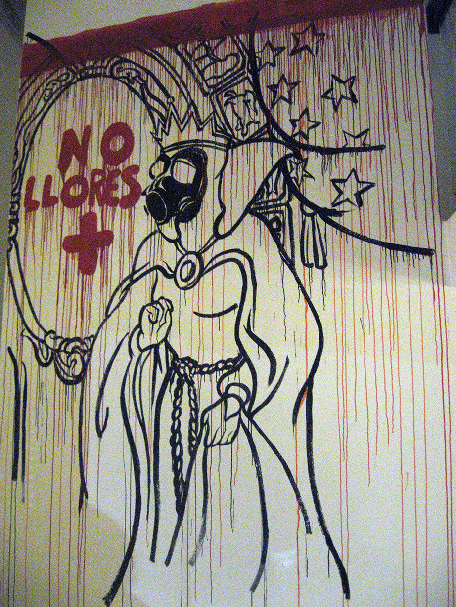 En esta misma sala, una pintada, a modo de cartel, una calavera nos advierte “No reír, peligro de muerte”. Al otro lado, un gran mural, hecho por Enrique Zabala, nos muestra un retrato del propio Pol Coronado, como demiurgo y padre. La imagen nos recuerda a la de la entrada, hecha con líneas negras, Coronado posee alas y una corona. Lágrimas rojas recorren su rostro. En el hombro un tatuaje exhibe la palabra “Dirty” con un tomatazo.